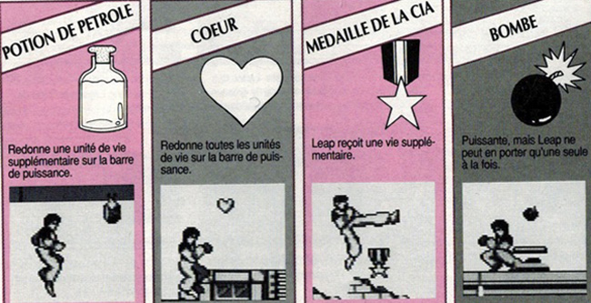 Les potions de pétrole vous redonneront une barre de vie, les cœurs une jauge complète de vie, les bombes, dévastatrices, qui ne peuvent être portées qu’une par une, et enfin, ce qu’ils appellent la « Médaille de la CIA » (??) qui vous redonne une vie supplémentaire… D’ailleurs pour ce dernier objet, franchement, c’est la seule façon que vous aurez de comprendre que vous bossez pour l’agence.