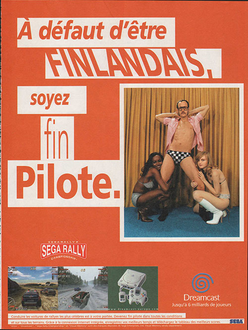 Après, comme d’hab, Sega fait des choix marketing un peu osés et vante les capacités online de sa machine, la Dreamcast étant une pionnière dans ce domaine jusque-là réservé au monde du PC (bon, il y avait quand même eu une tentative dans les années 1970 avec l’Atari VCS, en utilisant le réseau de télévision câblé américain). Mais je trouve que cette pub ne donne pas du tout envie de se prendre une Dreamcast, les publicités conceptuelles ne sont plus ce qu’elles ont été à l’époque de la Megadrive et des fabuleuses pubs avec Maître Sega. Et le slogan « jusqu’à 6 milliards de joueurs », c’est un peu prétentieux parce que je ne pense pas que les petits somaliens aient de connexion à l’internet, déjà qu’ils n’ont pas l’eau potable…
