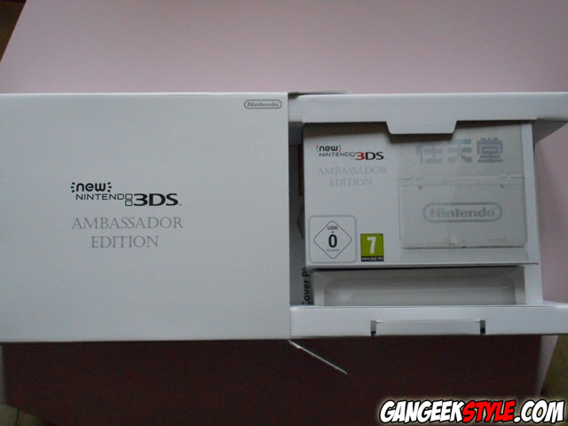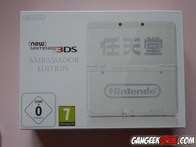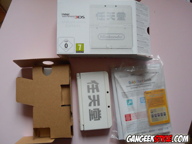 - Une New Nintendo 3DS (blanche) avec une coque exclusive Ambassador Edition (arrière), un stylet New Nintendo 3DS, une carte mémoire microSDHC de 4 Go, des cartes RA, un guide de démarrage rapide, le mode d’emploi de la console.