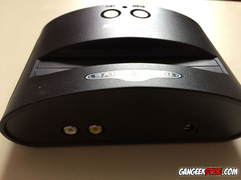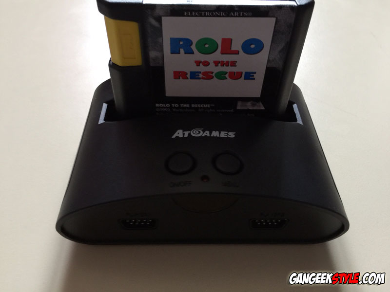 Le boitier console Megadrive ATGames est plutôt petit (environ 4x plus petit qu’une Megadrive I) et très léger, seul le logo de la Megadrive sur le dessus de la machine nous rappelle le lien de parenté avec la console originale de Sega. Il y a deux boutons interrupteurs (va-et-vient) sur le dessus de la console pour la mise sous tension et l’accès au menu des jeux inclus. Sur la façade avant, on trouve deux ports permettant de brancher deux bonnes vieilles manettes originales, et ce n’est pas un luxe, croyez-moi ! A l’arrière, on trouve le port pour l’adaptateur secteur et les sorties audio/vidéo : et là, on découvre que la Megadrive ATGames est en son mono, comme la Megadrive premier modèle (la Megadrive II est en stéréo).