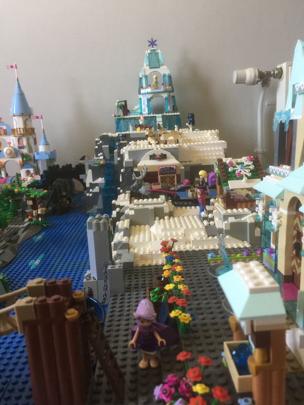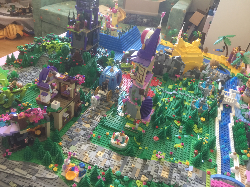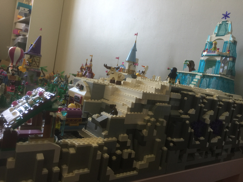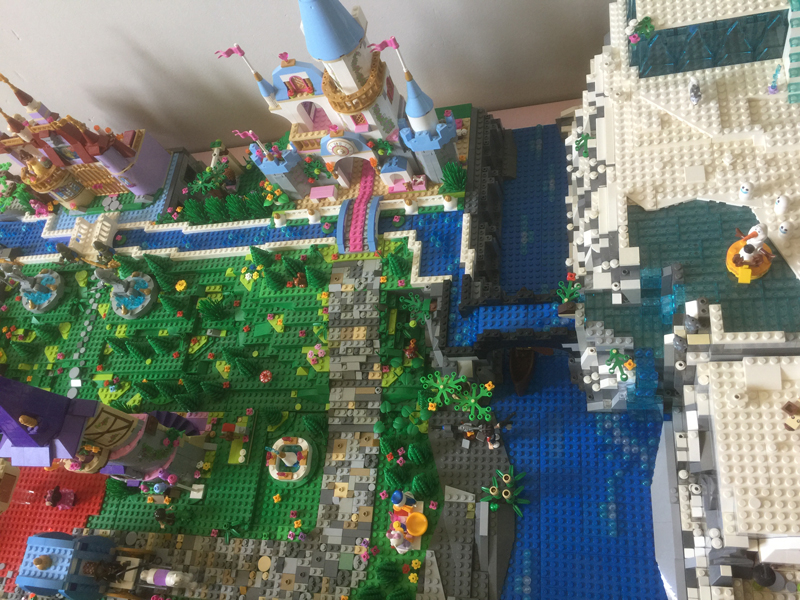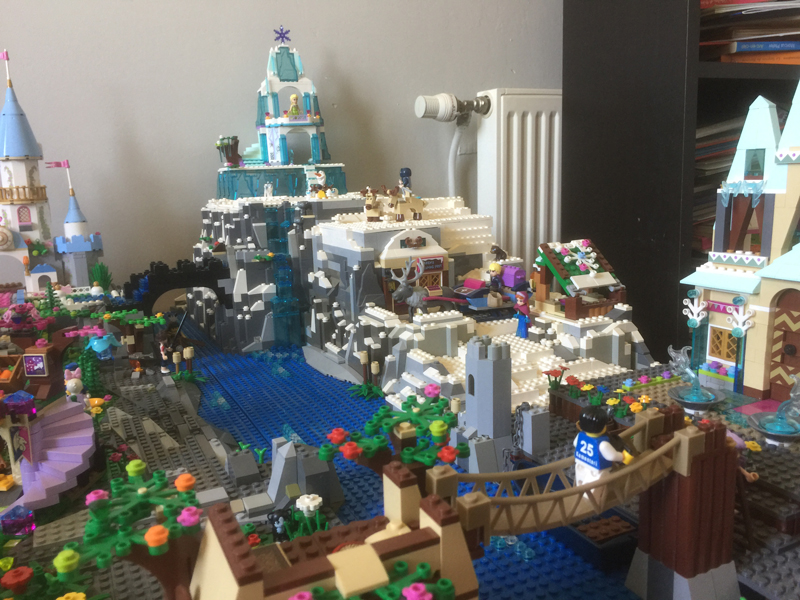 L’idée était vraiment de faire une jolie maquette, exposable en convention, mais surtout il fallait qu’elle soit fonctionnelle, car après l’exposition de Montereau, cette maquette sera utilisée comme support de jeu par mes deux filles. Pour la taille de la base, je me suis fier à mes tables IKEA. J’en ai 6 en tout, 3 en longueur, 2 en largeur, la maquette mesure environ 1m10 par 1m70. J’avais déjà fait auparavant un essai de village de princesses Disney mais il n’avait pas été conçu de sorte à être transporté. De plus, la montagne que j’avais faite pour y mettre le château de la reine des neiges ne me convenait pas du tout : elle était minable ! Bref, aucun scrupule à tout démonter et à recommencer mais cette fois, en construisant plaque de base par plaque de base, de sorte à faciliter le transport. En gros, à part quelques briques placées à certains endroits stratégiques, les plaques ne sont pas fixées entre elles.
