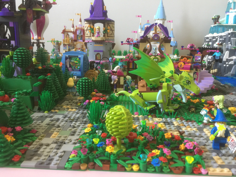 Les sets Elves utilisés : Château de Ragana 41180 et Marché secret 41176. J’ai un peu modifier le château de Ragana parce que je voulais qu’il soit plus imposant en hauteur et moins long, pour tenir sur la plaque que je voulais utiliser. J’ai donc fait un étage supplémentaire et ai attribué ce château à Maléfique !