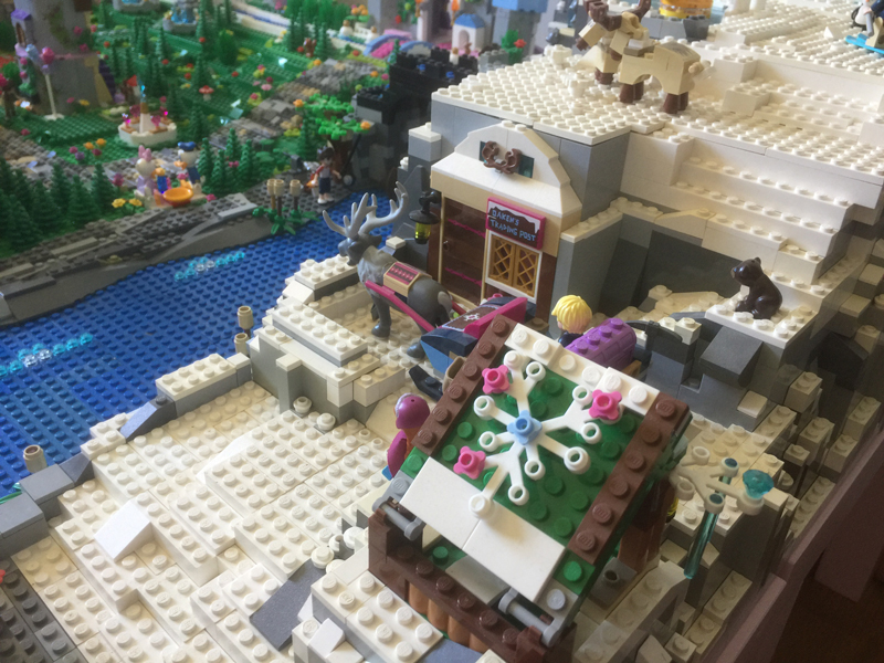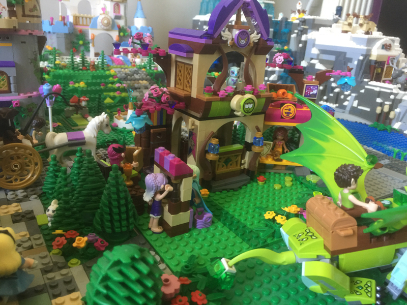 Il restait un peu de place sur le devant entre le château de Maléfique et le pont reliant à Arendelle. Ma fille a reçu un set Elves pour son anniversaire début Mars : le marché secret. Et bien, cela permettra de compléter notre village. Un village sans commerce, ce n’était pas possible !
