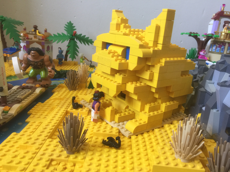Une fois les châteaux de Cendrillon et de la Belle et la Bête convenablement installés, j’ai aménagé façon plage de sable la partie extérieure de la nouvelle rivière se jetant dans la mer un peu plus loin. J’avais deux vieilles plaques que je voulais absolument intégrer à mon diorama qui se prêtait bien à cela. J’ai utilisé du jaune poussin parce que j’en avais masse dans mon vrac, oui ça pète un peu je l’admets, mais je ne voulais pas exploser mon budget, qui en a pris un coup avec l’achat des blocs montagneux puis toute la végétation. Une fois installé le petit palais de Jasmine et le bâteau de Vaiana, il reste un peu de place pour y mettre le rocher de Te Ka/Te Fiti.