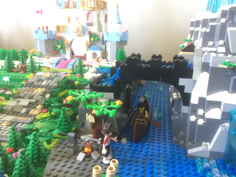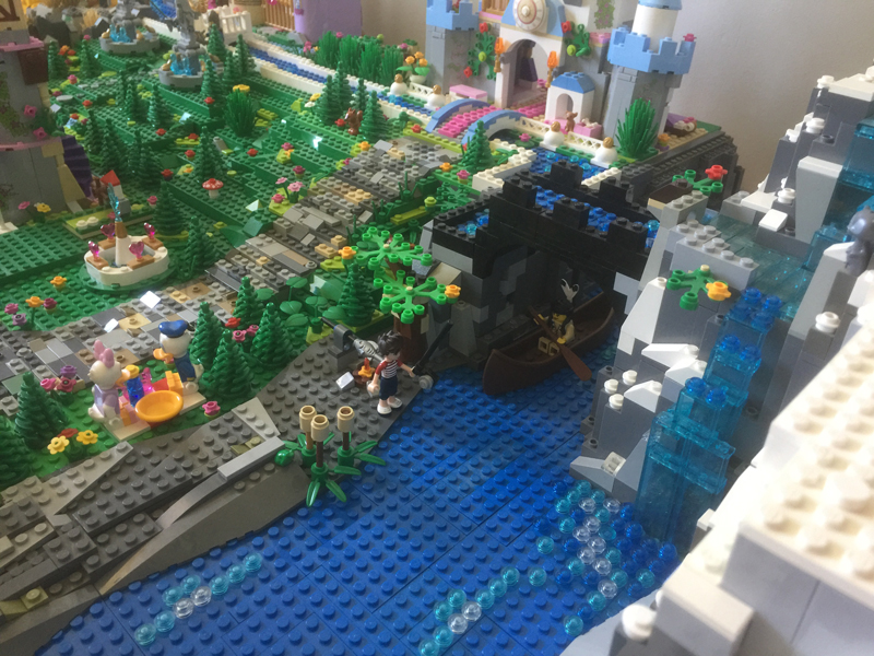 Après la montagne de la Reine des neiges, j’ai réfléchis à la meilleure manière d’aborder ma rivière coulant devant les châteaux de Cendrillon et de la Belle et la Bête. J’avais en ma possession pas mal de vieilles plaques épaisses vertes et rectangulaires. J’ai donc travailler chaque plaque de base (32×32) de chacun des châteaux indépendamment, tout en faisant attention à avoir un relief similaire au niveau des jonctions. Et comme j’ai pensé que ça serait cool quand même d’avoir une rivière assez large au sol, j’ai fait un petit pont pour la petite rivière du dessus, avec un système de double chute d’eau. Ne vous triturez pas les méninges, vous comprendrez mieux avec les photos.