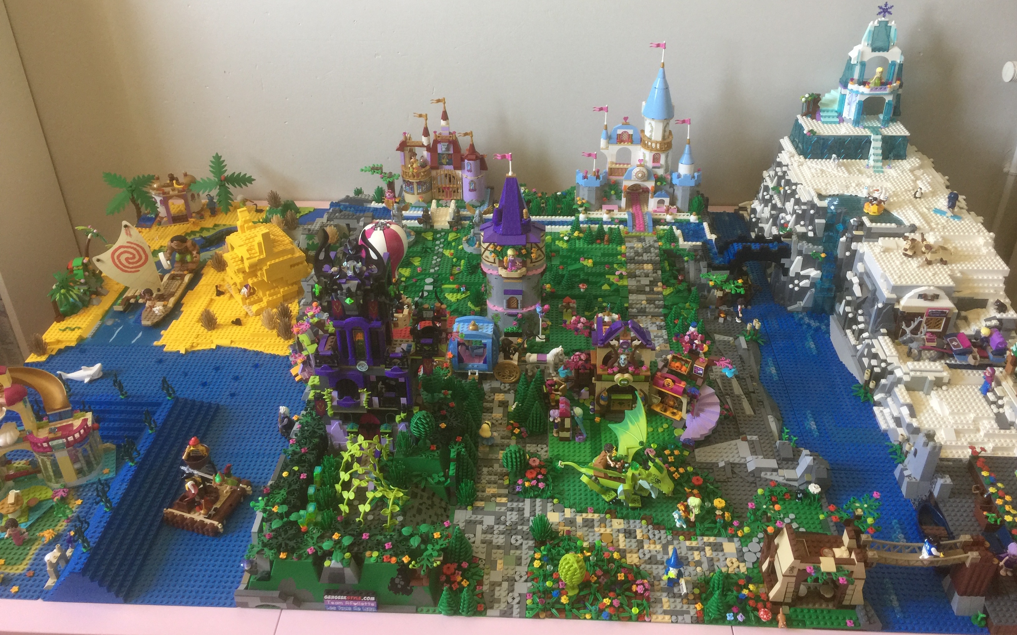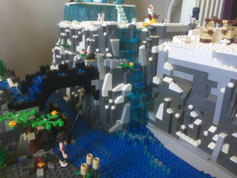 Très cool, la maquette! Je suis pas du tout fan des princesses, (après tout, je ne suis pas une fillette) mais j’apprécie néanmoins tout le travail qui a été mis là-dedans! La géographie en particulier m’as beaucoup plu et pour moi le clou du spectacle c’est la montagne de la reine des neiges! Le volume est imposant, elle domine vraiment le reste. Props pour le glacier et la neige accumulée sur les flancs!