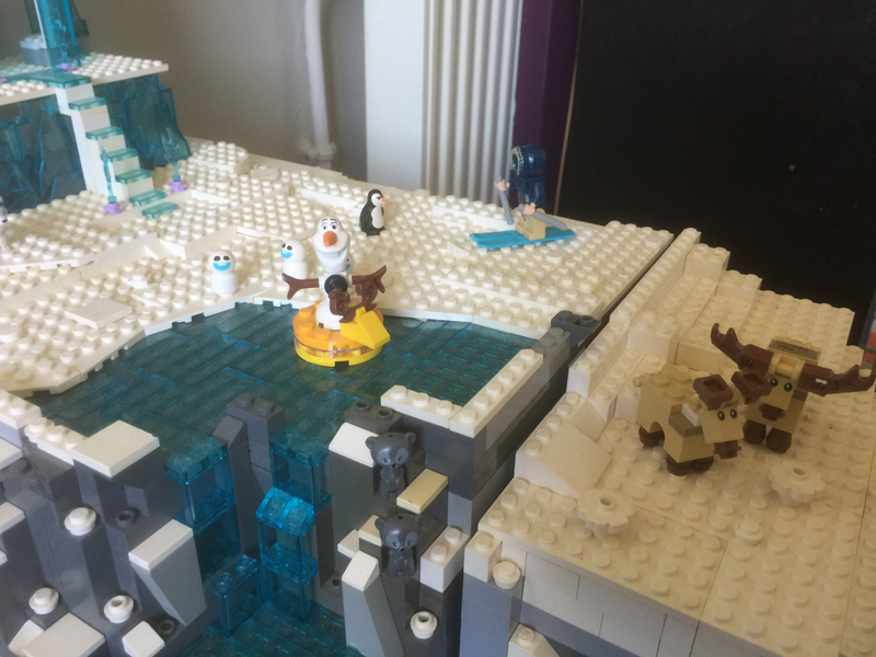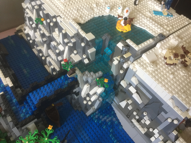 J’ai commencé par ce qui m’a pris le plus de temps, environ 2 semaines : la montagne de neige. En réalité, je me suis replantée dès le début en refaisant une montagne réduite, avec juste la place de poser le palais de glace d’Elsa au sommet (plaque 2 en fait) car je n’avais pas d’autres pièces grises pour faire mieux. Je n’avais pas la place pour mettre un lac gelé. Du coup, je me suis décidée à commander des pièces détachées sur bricklink pour cette partie, notamment des blocs rocheux 6082 et diverses briques grises. J’en ai profité pour me prendre également des pièces glacées, notamment des tiles (plaques plates sans tenons) ainsi que des rochers de glace, afin de surélever encore le palais et le rendre plus majestueux ! J’ai donc construit une montagne plus haute sur ma plaque 1.