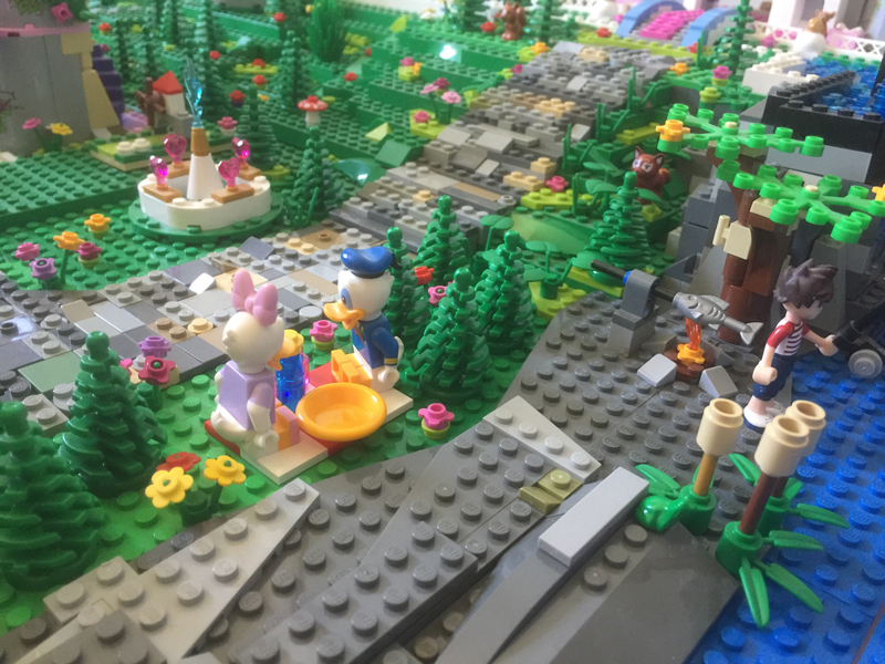 Pour terminer, j’ai choisi de faire un chemin reliant tous les châteaux. J’ai enlevé celui que j’avais commencé en jaune, ce n’était pas joli et j’ai construit un chemin en gris clair et gris foncé principalement, mais aussi avec d’autres nuances, en utilisant de petites plates ou tiles, le plus du souvent du 1×2 ou du 2×2. Afin de conserver mon cœur, j’ai fait un chemin avec des tiles grises rondes et carrées pour l’accès au château de la Belle et la Bête. J’ai réitéré ce choix pour l’accès au pont.