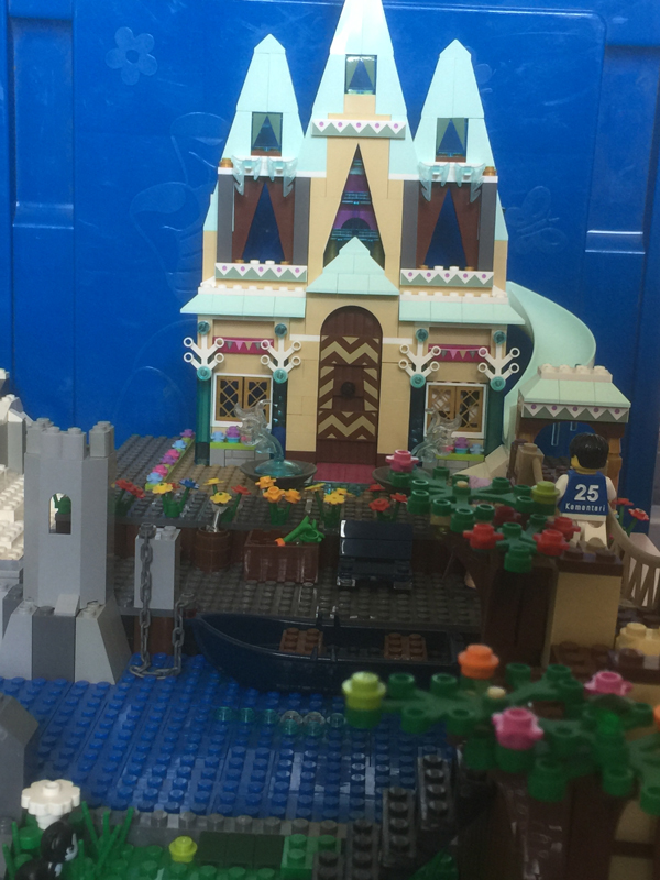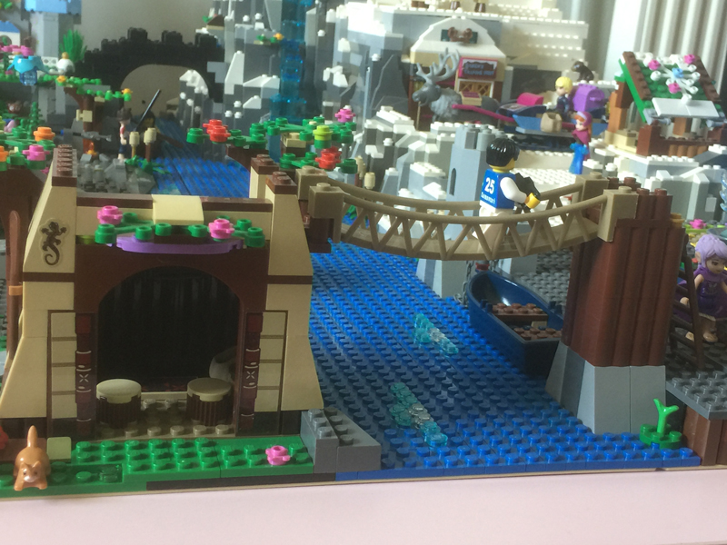 Il me fallait maintenant surélever un peu mon château d’Arendelle à cause de la grande rivière passant juste à côté et il me fallait également réfléchir à un pont reliant la partie Reine des neiges au reste de la maquette. Pour la surélévation, je me suis dit qu’une plateforme sur rondins de bois pouvait être une solution. J’ai fait une première partie plus basse pour le port, avec quelques caisses et tonneaux de vivres trainant sur le quai et une seconde partie plus élevée pour le château. A l’origine, je voulais construire un gros pont, où les véhicules auraient pu circuler, mais vu le peu d’espace disponible à Arendelle, j’ai préféré un pont piéton, beaucoup plus facile à réaliser. En plus, Arendelle, c’est une île à la base. D’un côté, une simple échelle à barreau, de l’autre, j’ai réutilisé une structure d’un set Vaiana que ma gamine (la plus petite, 3ans et demi) avait démoli avec l’ajout d’un escalier.